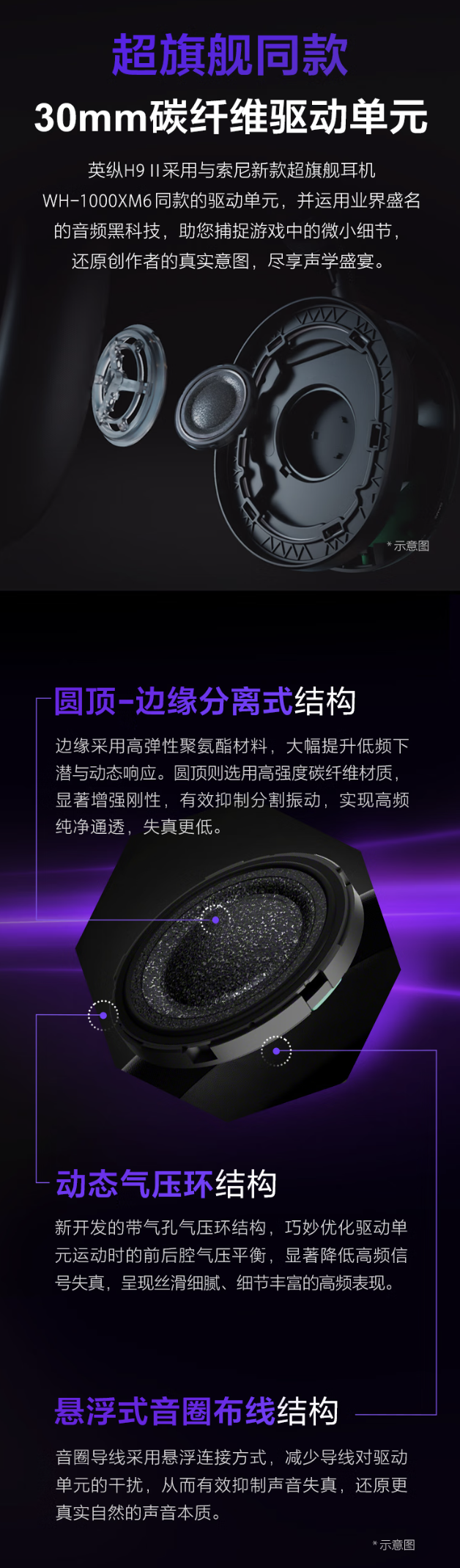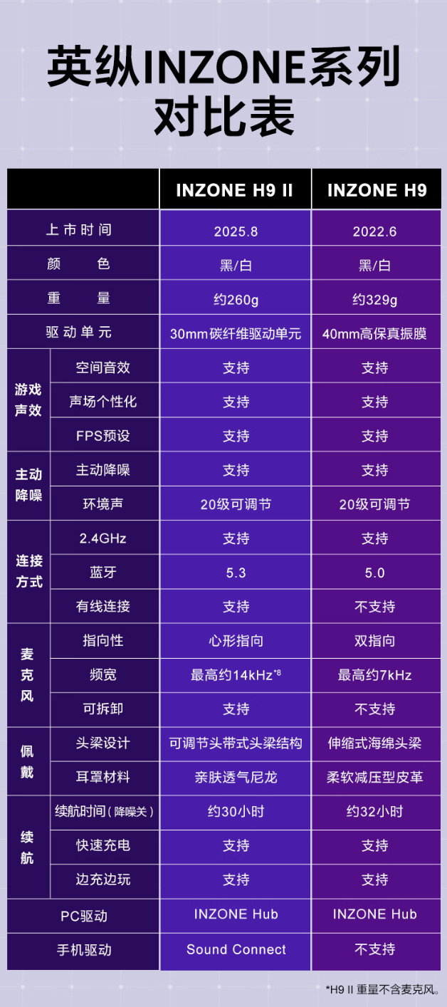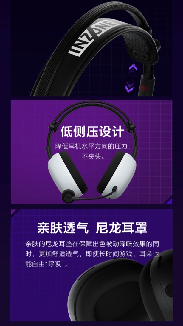 该耳机整体重量 260 克,配备可调节头带式头梁。内置 WH-1000XM6 同款 30mm 碳纤维驱动单元,采用动态气压环、悬浮式英圈布线结构,强调高频表现。同时耳机支持虚拟 7.1 声道、主动降噪、声场个性化特性。耳机配备的电池提供至高 30 小时。